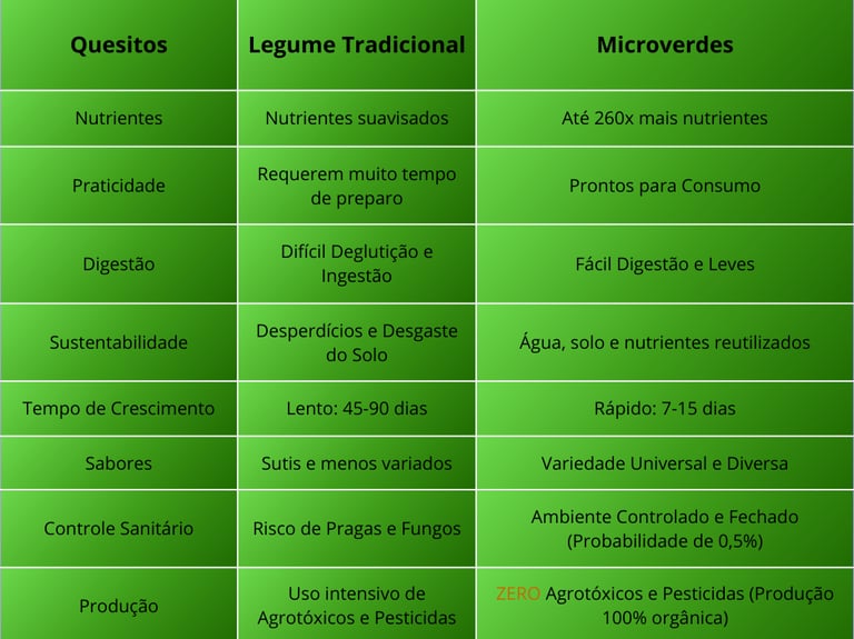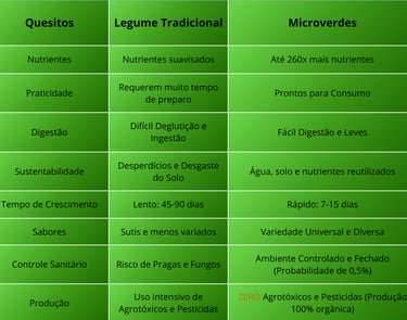 Os microverdes possuem uma concentração de nutrientes muito maior em comparação com os vegetais tradicionais, além de serem mais práticos, crescendo em apenas 7-21 dias, enquanto os vegetais tradicionais levam de 15 dias a 2 meses.